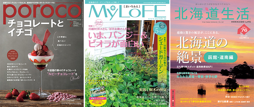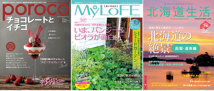 えんれいしゃ発行雑誌「poroco」および「MyLoFE(まいろふえ)」と「北海道生活」に掲載している写真を二次使用することが可能になりました。新規に撮影することに比べて、コストパフォーマンスがよく、クオリティも高く制作物・WEBに使用することができます。